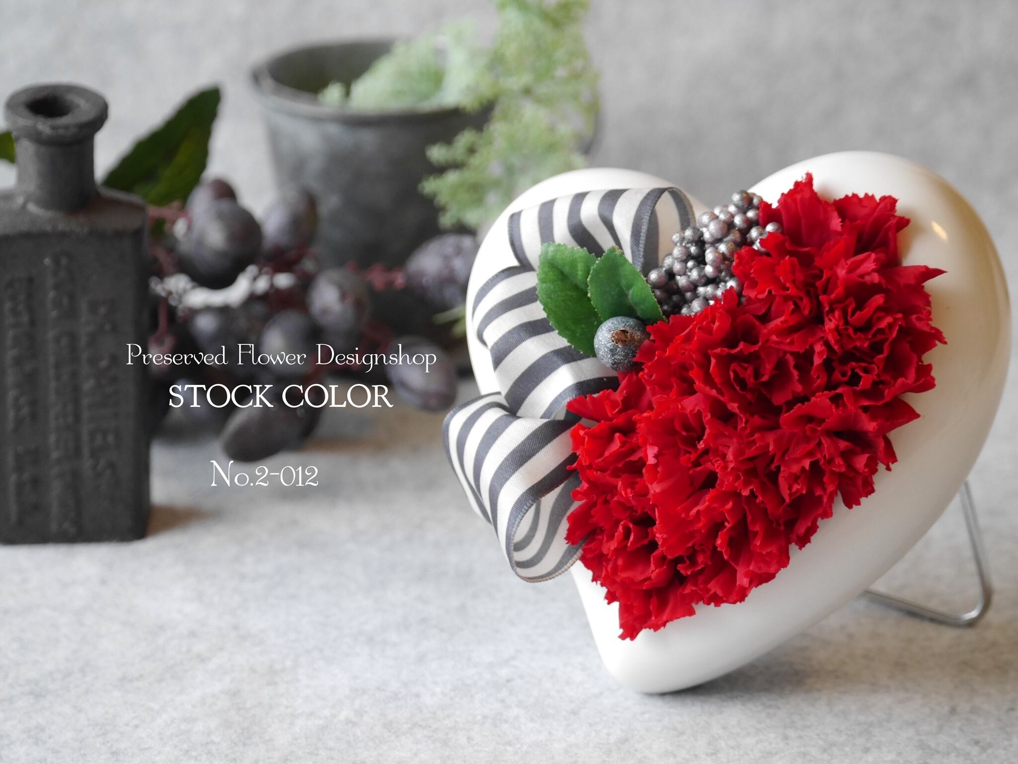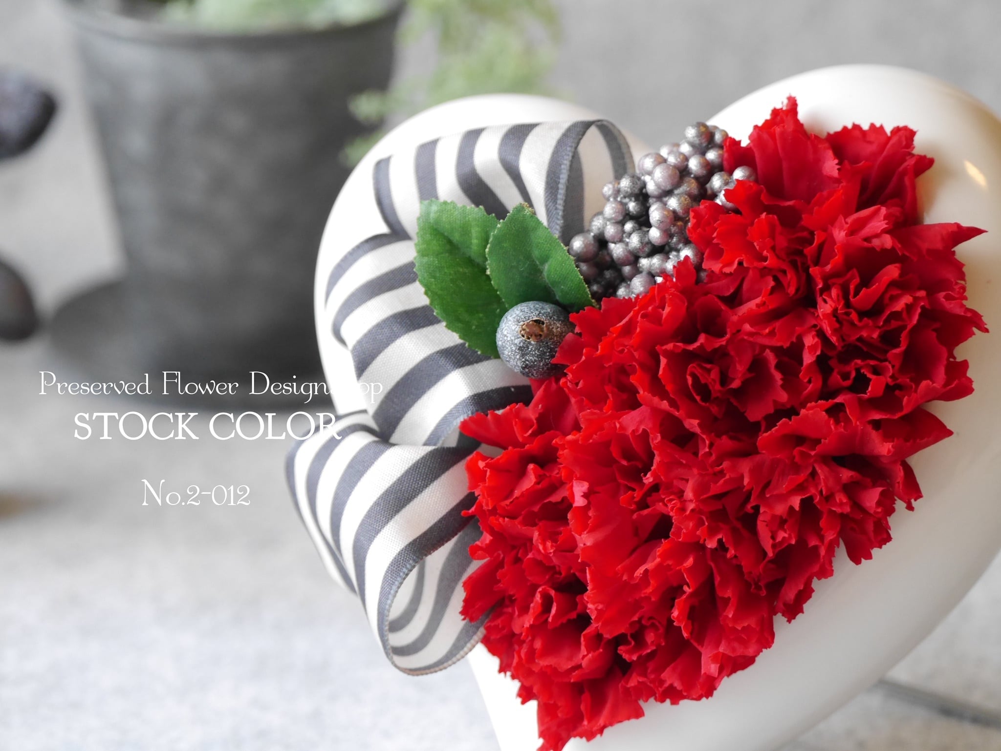 艶のあるハートのフレーム(陶器)に、赤いカーネーションとストライプのリボンを合わせてモダンにアレンジ。