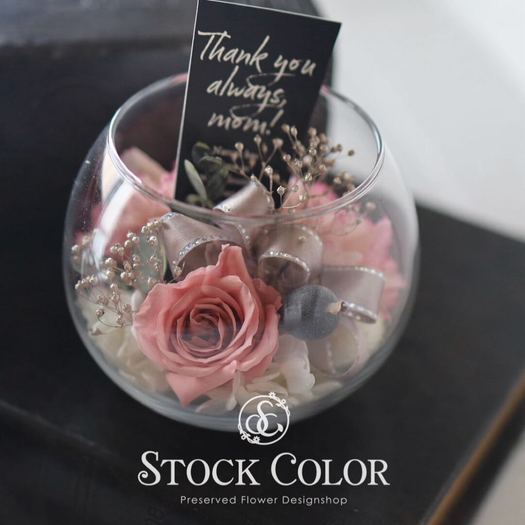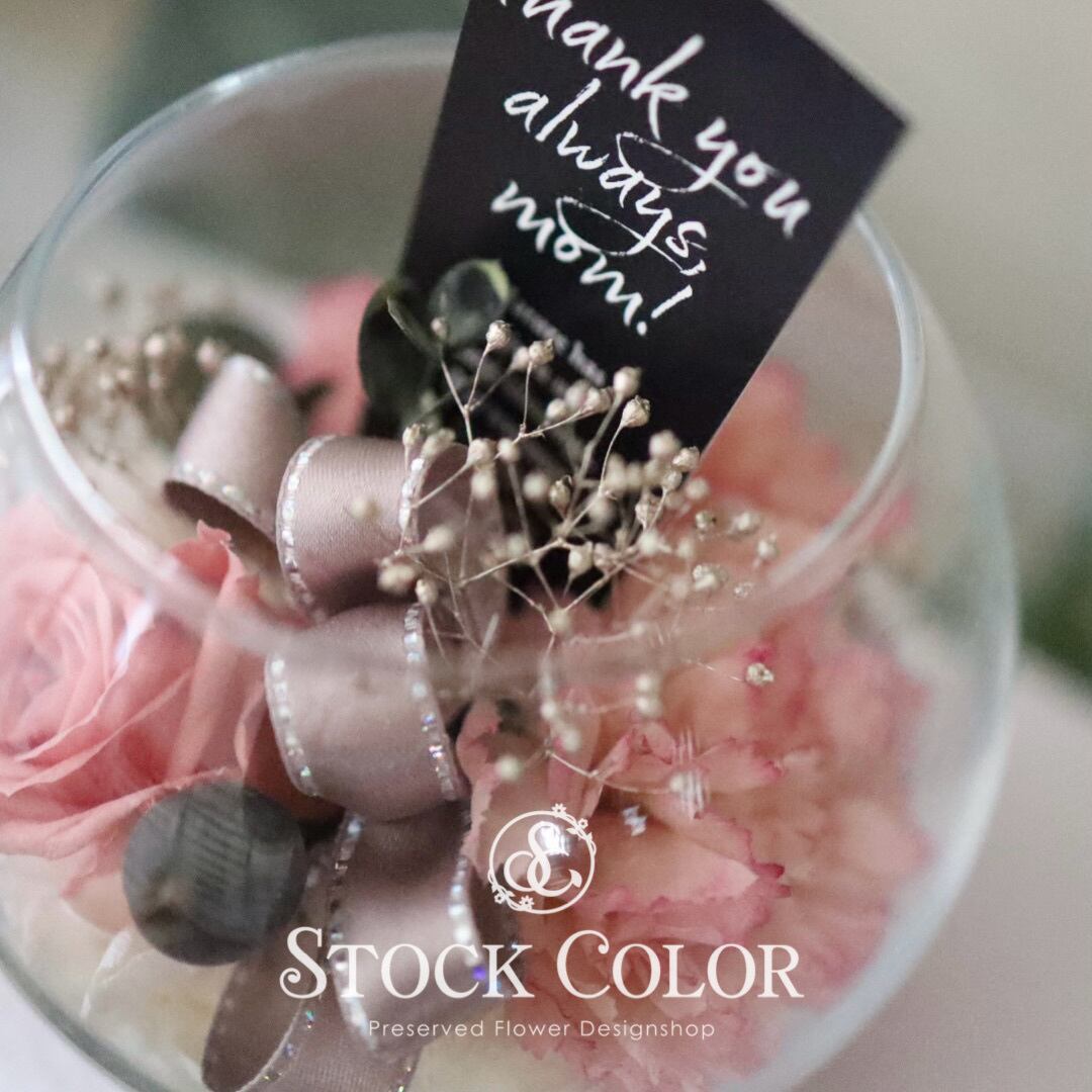 コロンとしたフォルムが可愛らしいガラスのフラワーポットに、モーブピンクのローズやカーネーションなどのプリザーブドフラワーをたっぷり閉じ込めました。
