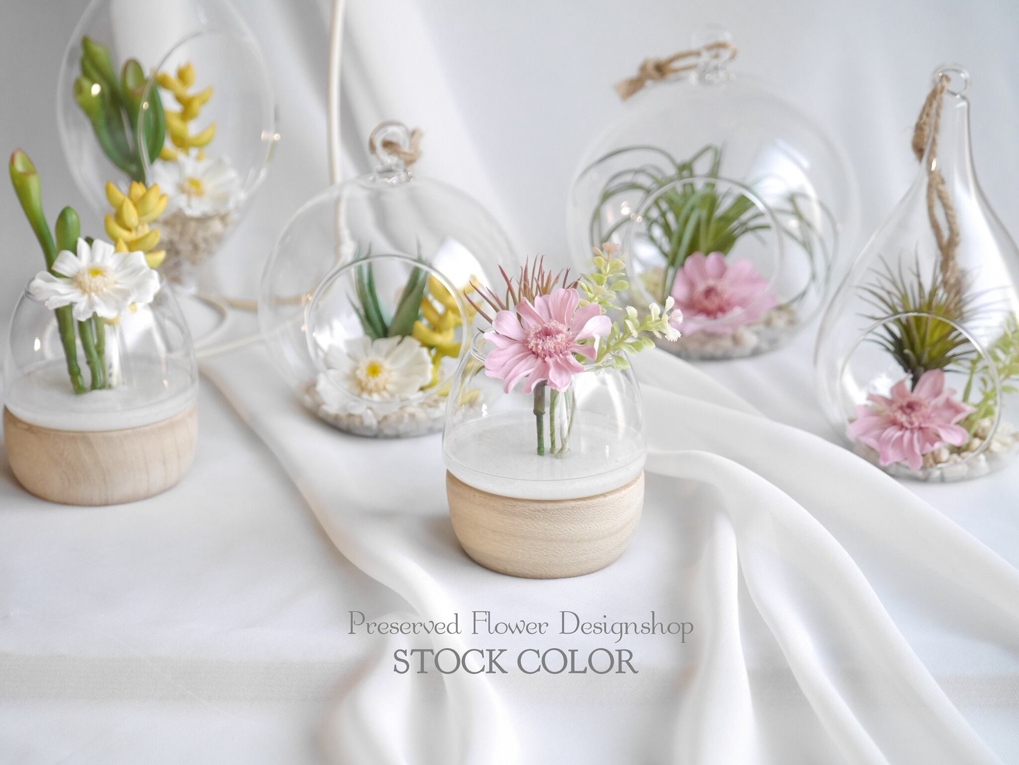さまざまなフォルムのガラスのフラワーベースに、今人気のフェイク多肉と、可愛らしいプリザーブドフラワーのミニジニアを添えた夏のインテリアにぴったりなオリジナルアレンジです。