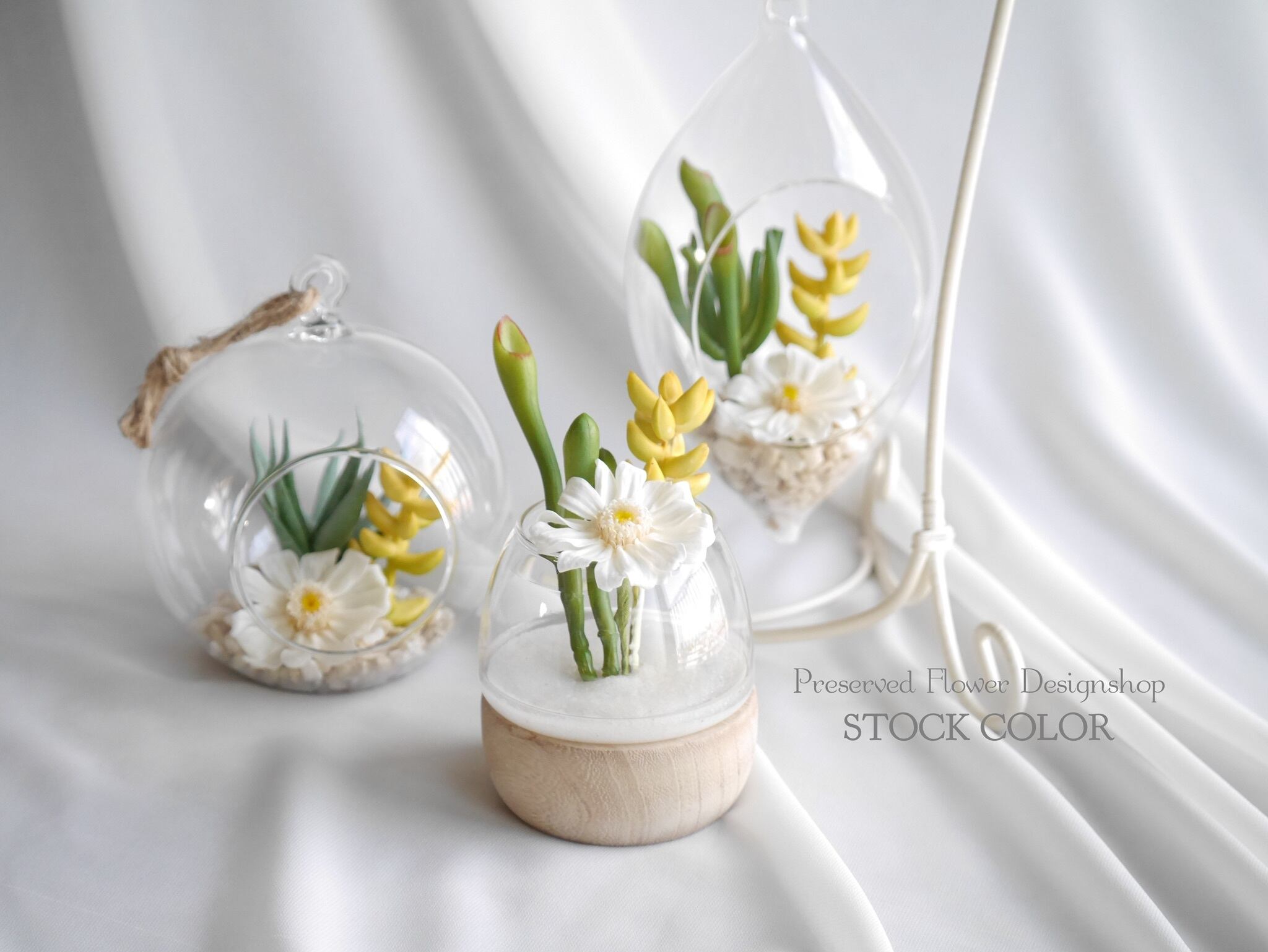 ミニジニアのお色は、優しいサマーピンクと、黄色のフェイク多肉との相性が爽やかなサマーホワイトの2色。ガラスポットはサイズ、形が違うデザインです。