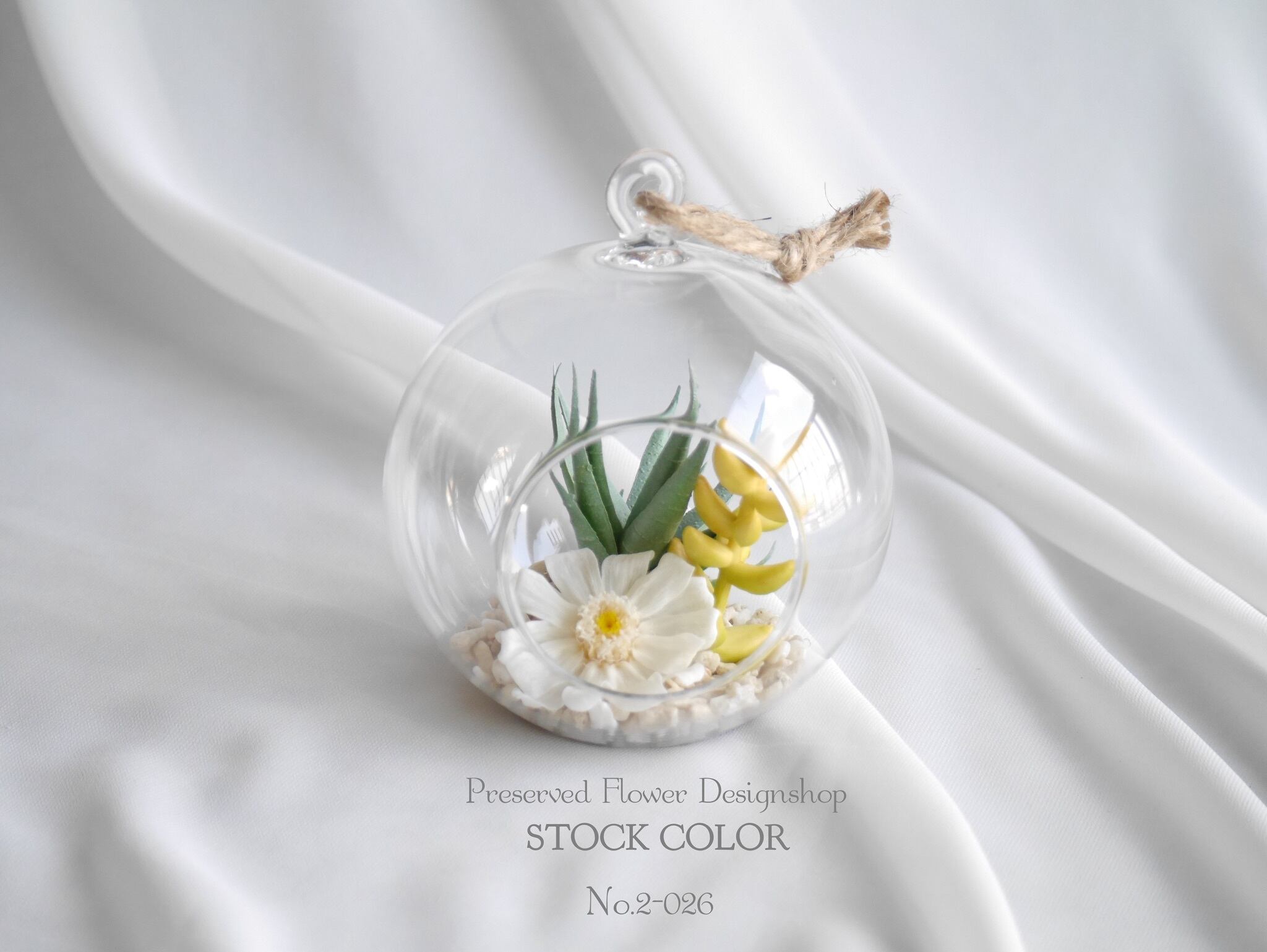 フェイク多肉とプリザーブドフラワーの夏アレンジ*丸ガラス(M)