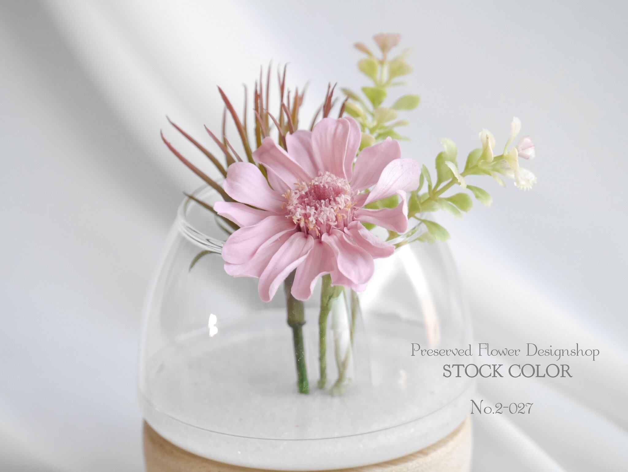 さまざまなフォルムのガラスのフラワーベースに、今人気のフェイク多肉と、可愛らしいプリザーブドフラワーのミニジニアを添えた夏のインテリアにぴったりなオリジナルアレンジです。