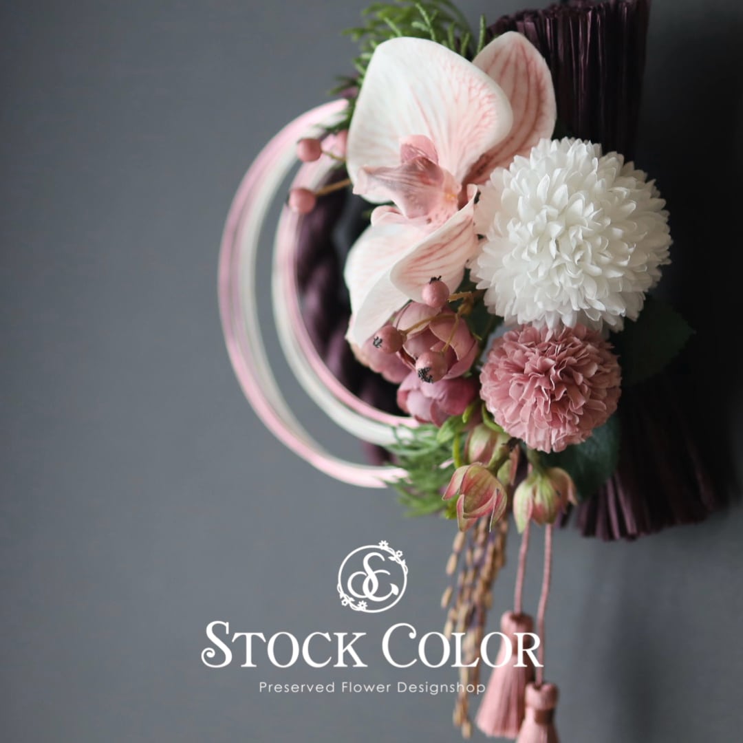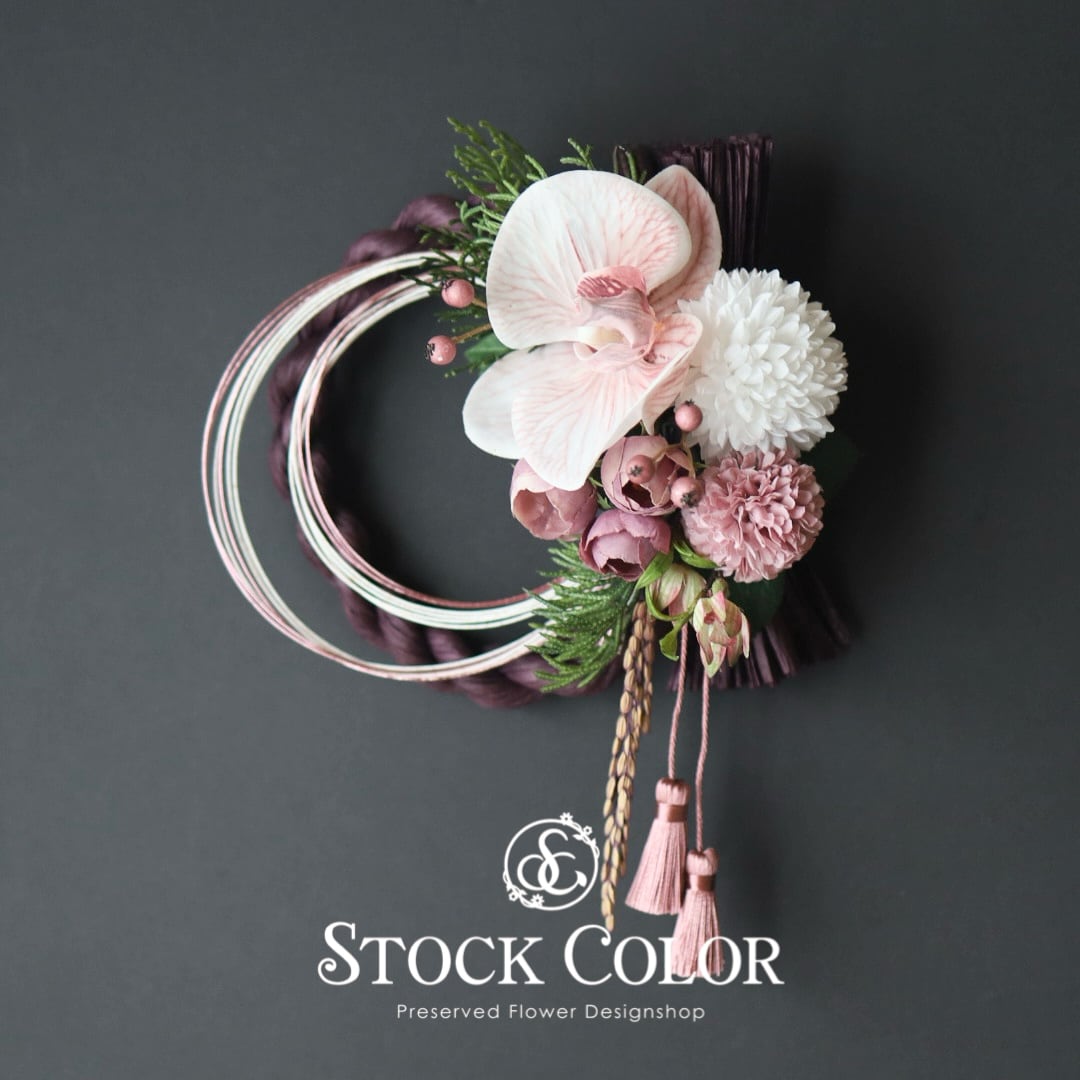 落ち着きのあるダークパープルのしめ縄に、おしゃれなモーブピンクの胡蝶蘭やマムを合わせたしめ縄アレンジ。
