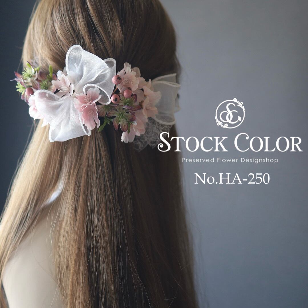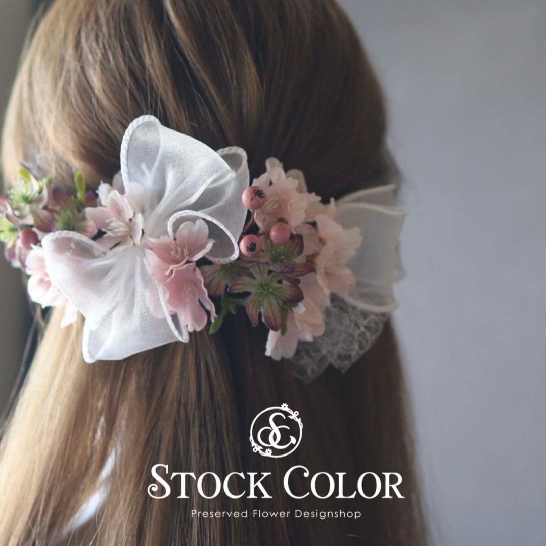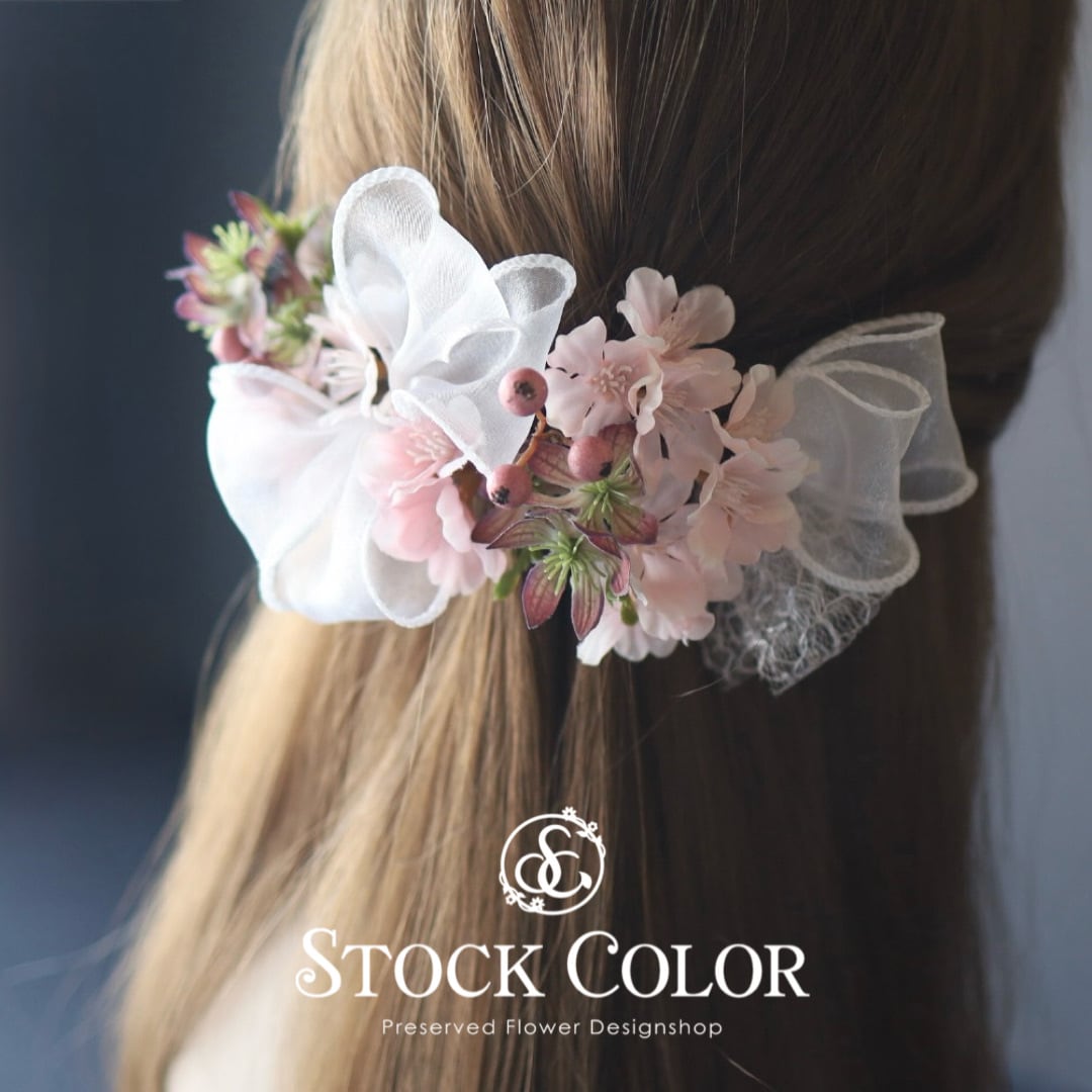 アートフラワーの桜に、トレンドのオーガンジーリボンを合わせたヘッドドレス ヘアアクセサリー。