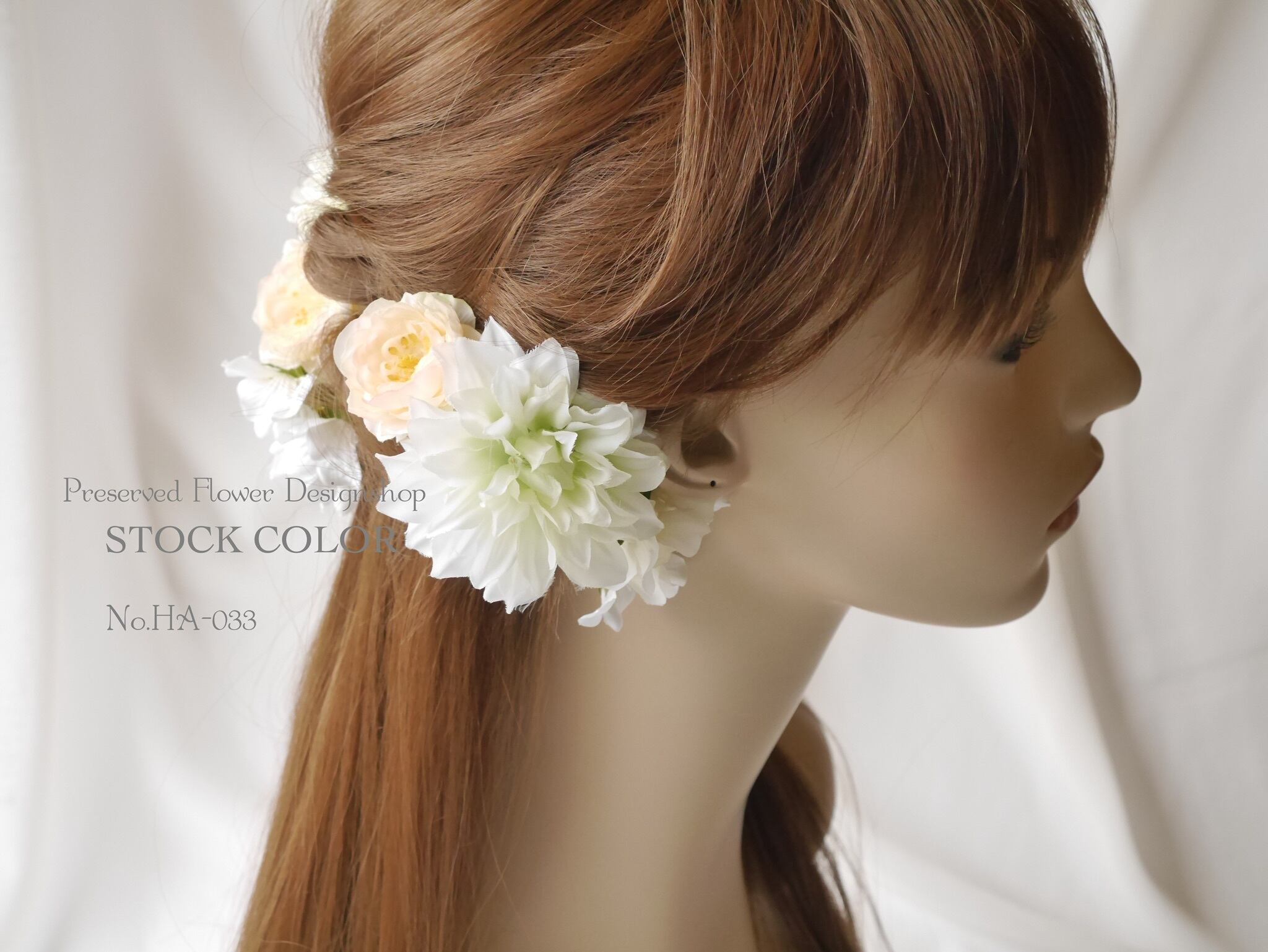 ダリアやクリスマスローズ、バラやマムを使ったウェディングにおすすめのヘッドドレス/ヘアアクセサリー。