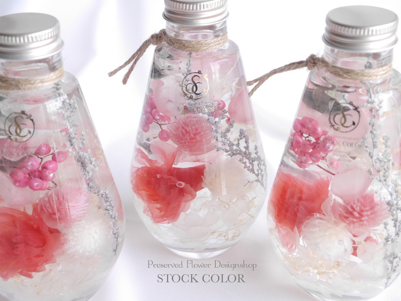ハーバリウムはプリザーブドフラワーやドライフラワーをガラスボトルに入れて専用のオイルに浸すことで、みずみずしい状態でお花や植物を長くお楽しみ頂ける、今注目のアイテムです。