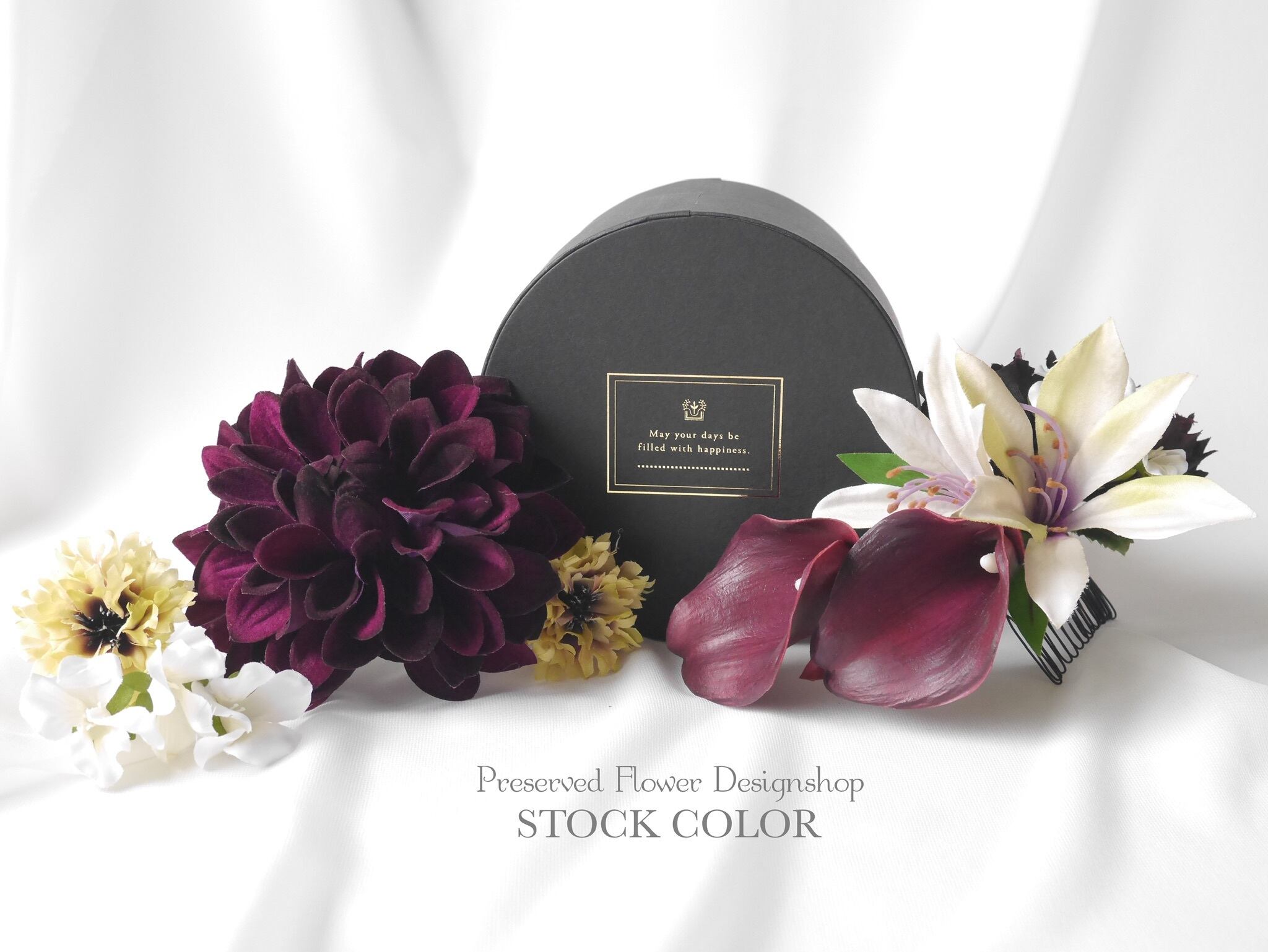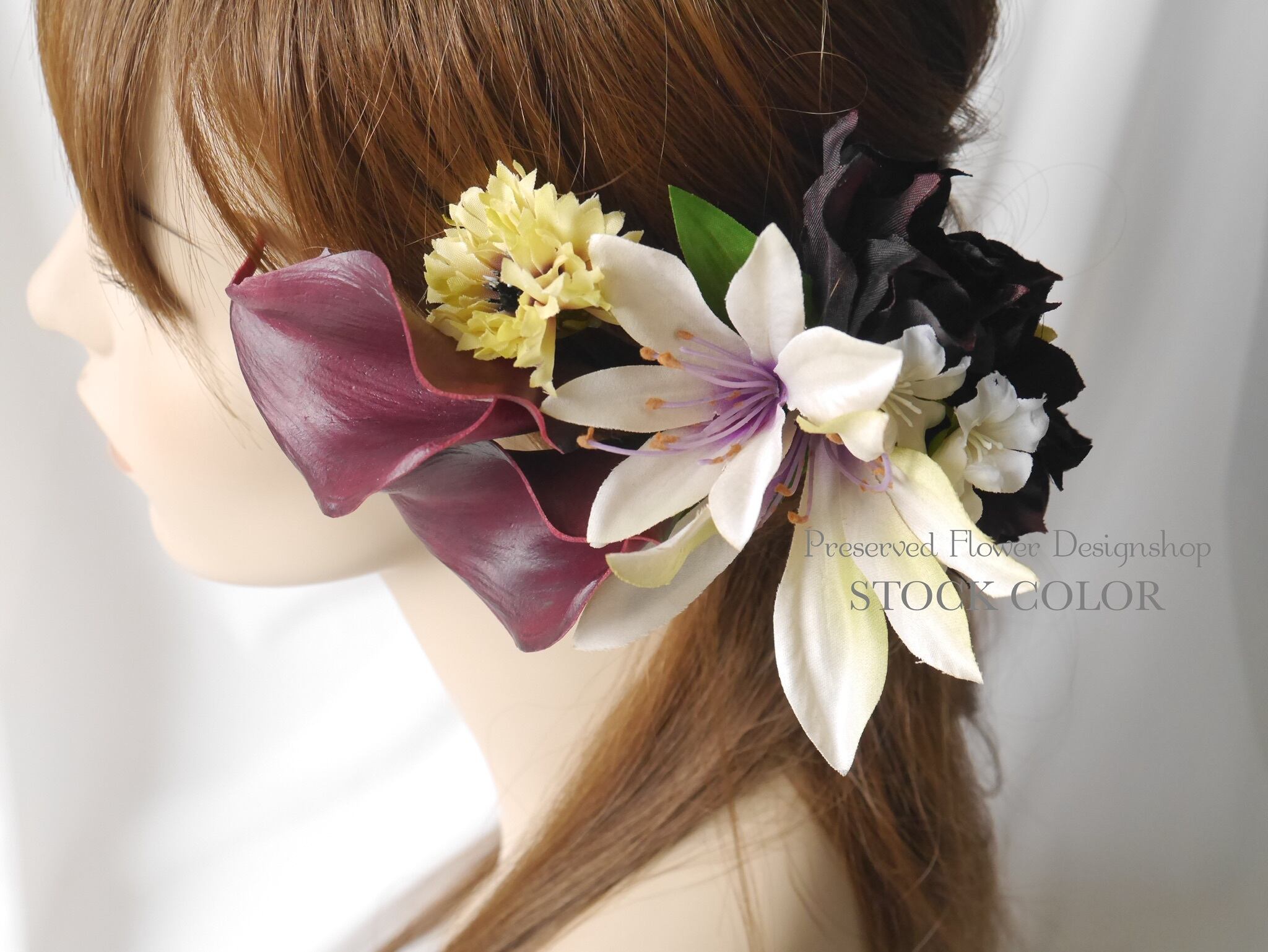 深みのある紫のダリアにカラーやクリスマスローズ、リリーを合わせたヘッドドレス/ヘアアクセサリー。
