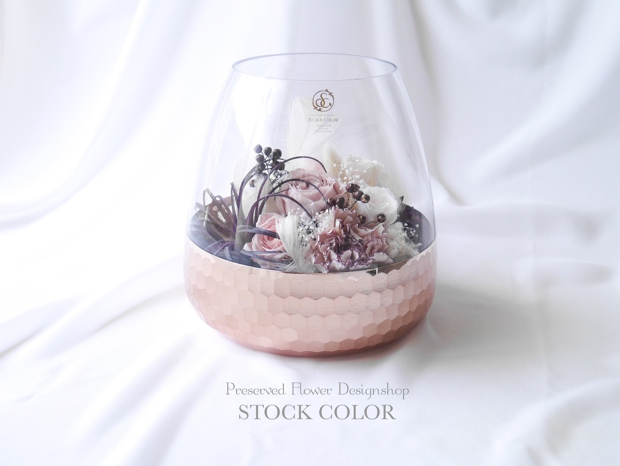ピンクゴールドのメタリック加工が施された高級感のあるデザインガラスのフラワーポットに、プリザーブドフラワーのローズやカーネーションをたっぷり使ったフラワーアレンジメントを閉じ込めました。