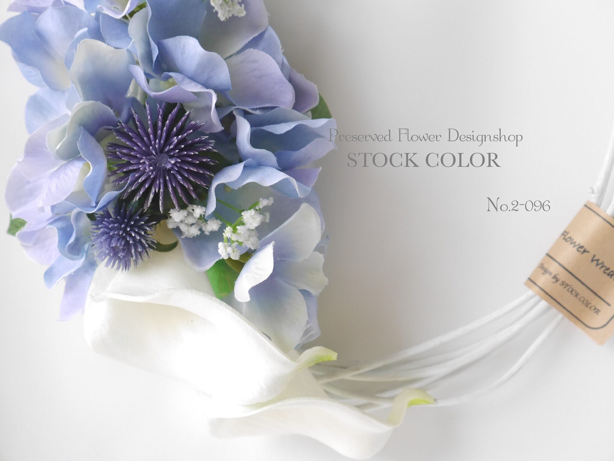 ブルーとバイオレットのグラデーションカラーが特徴のアジサイに、ホワイトのカラーリリィーやかすみ草を合わせた初夏にぴったりのフラワーリース。