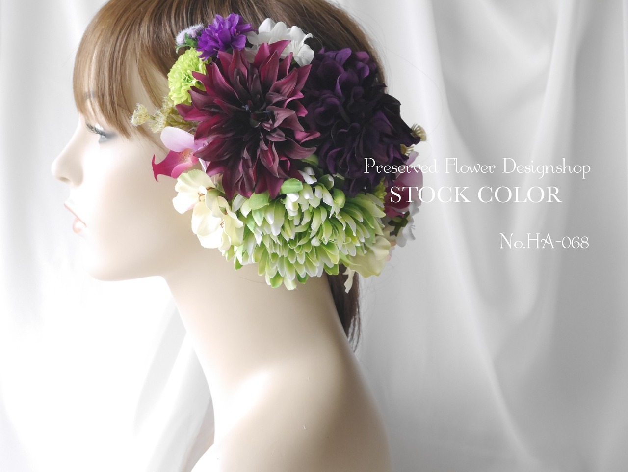 ダリアとコチョウランのヘッドドレス/ヘアアクセサリー(パープルグリーン)*結婚式・成人式・ウェディングドレスに