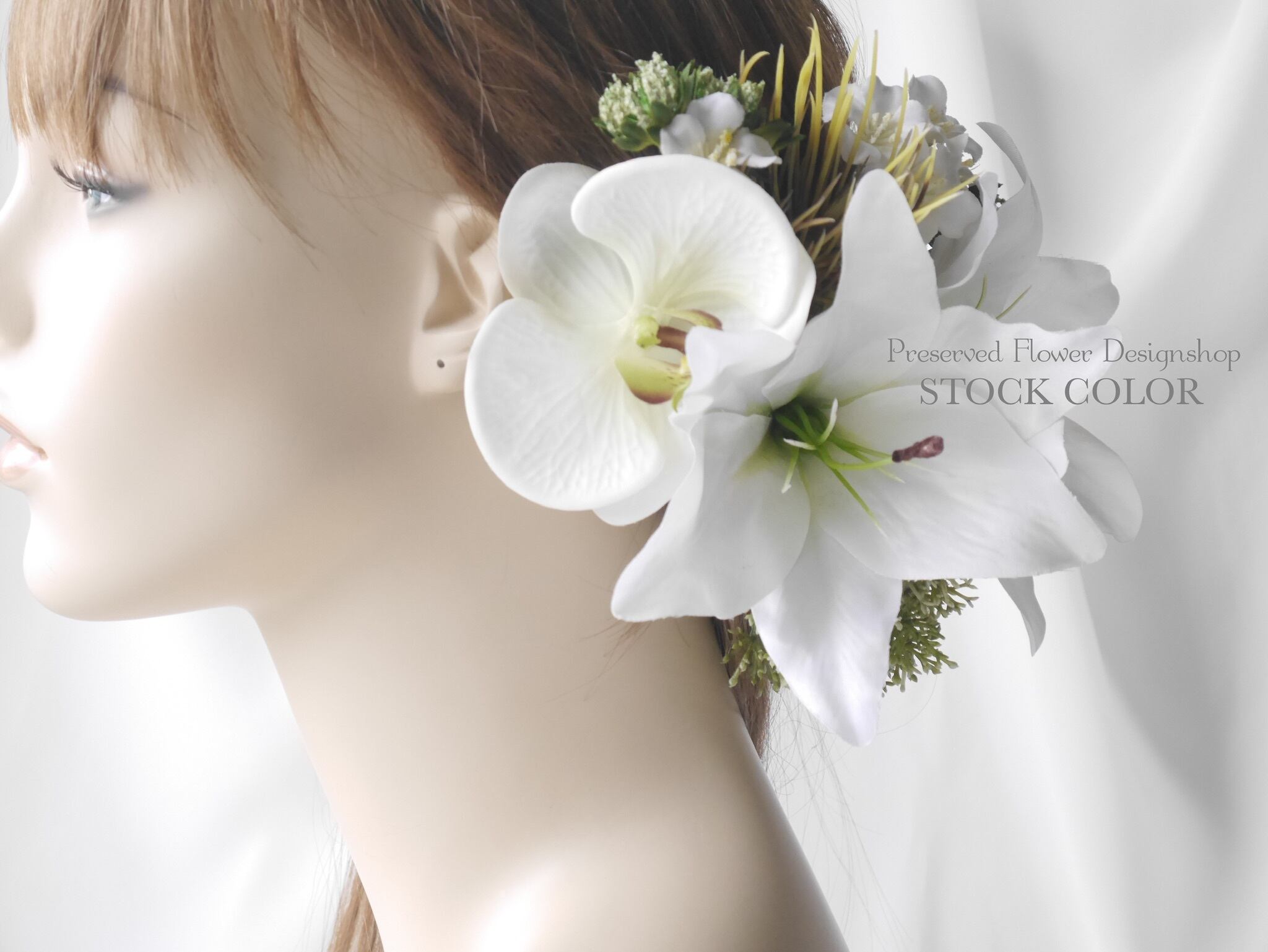 存在感のある大ぶりのユリと胡蝶蘭を合わせた、ヘッドドレス/ヘアアクセサリー。
