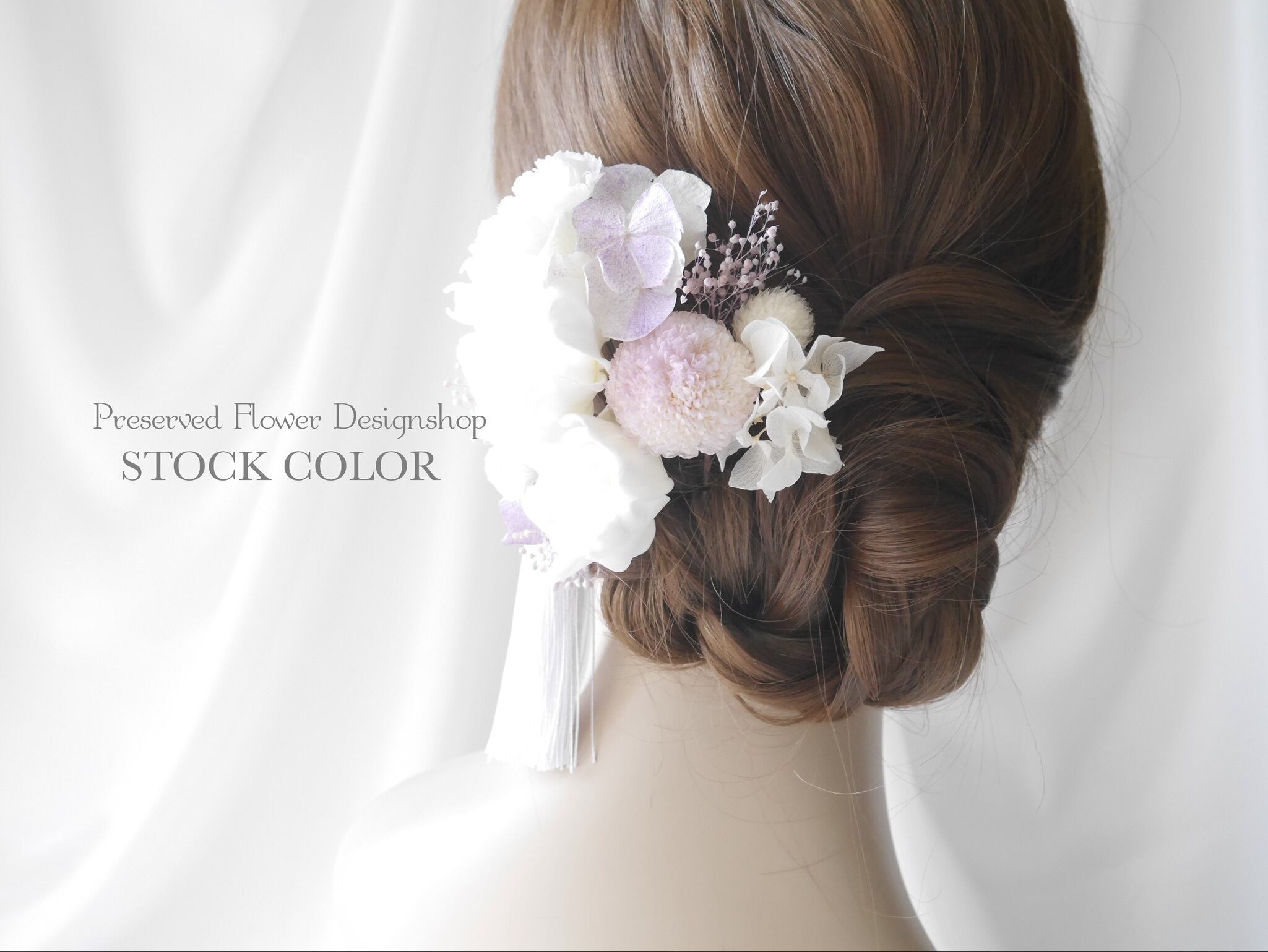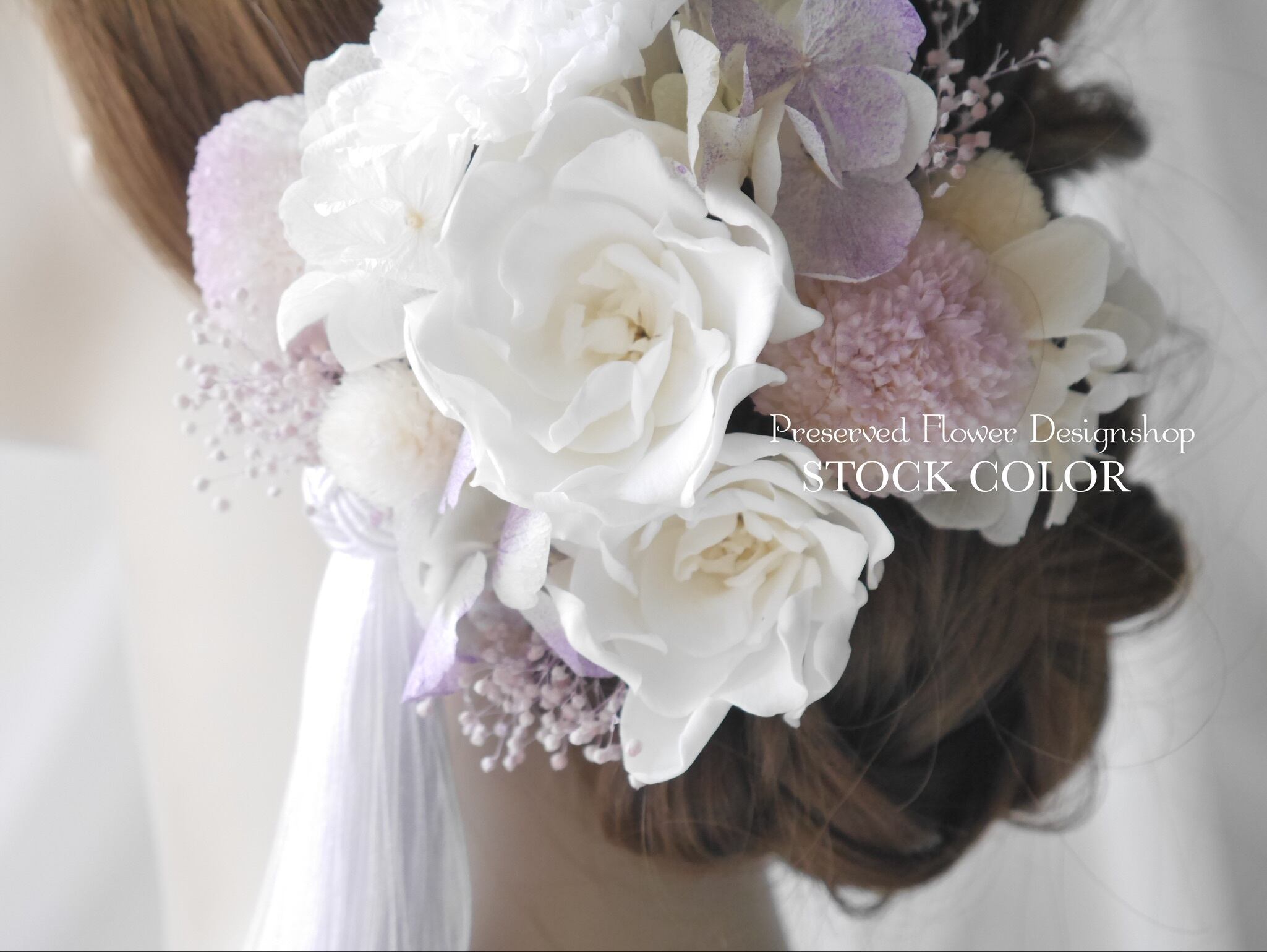 全て高品質のプリザーブドフラワーを使用しています。プリザーブドフラワーならではの繊細で柔らかな質感、上品さが魅力のヘッドパーツは、白無垢・ウェディングドレス、成人式などにおすすめです。