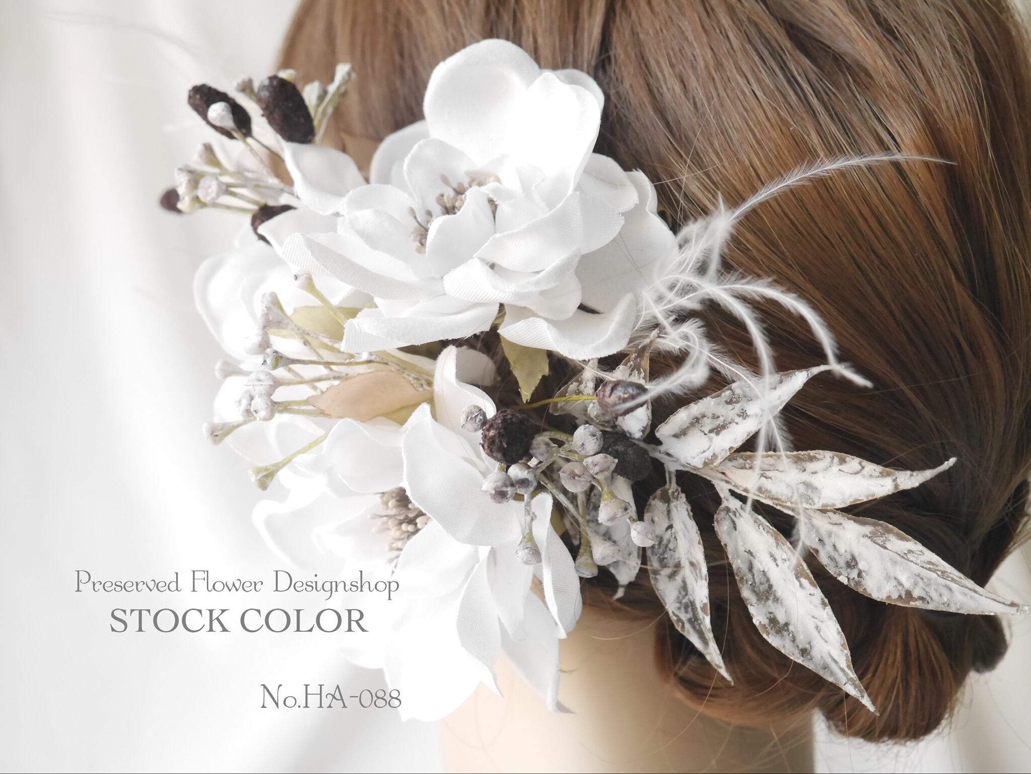 ホワイトのデザインアネモネに、ふわふわのステファ、ベリーやリーフを合わせたヘッドドレス/ヘアアクセサリー。