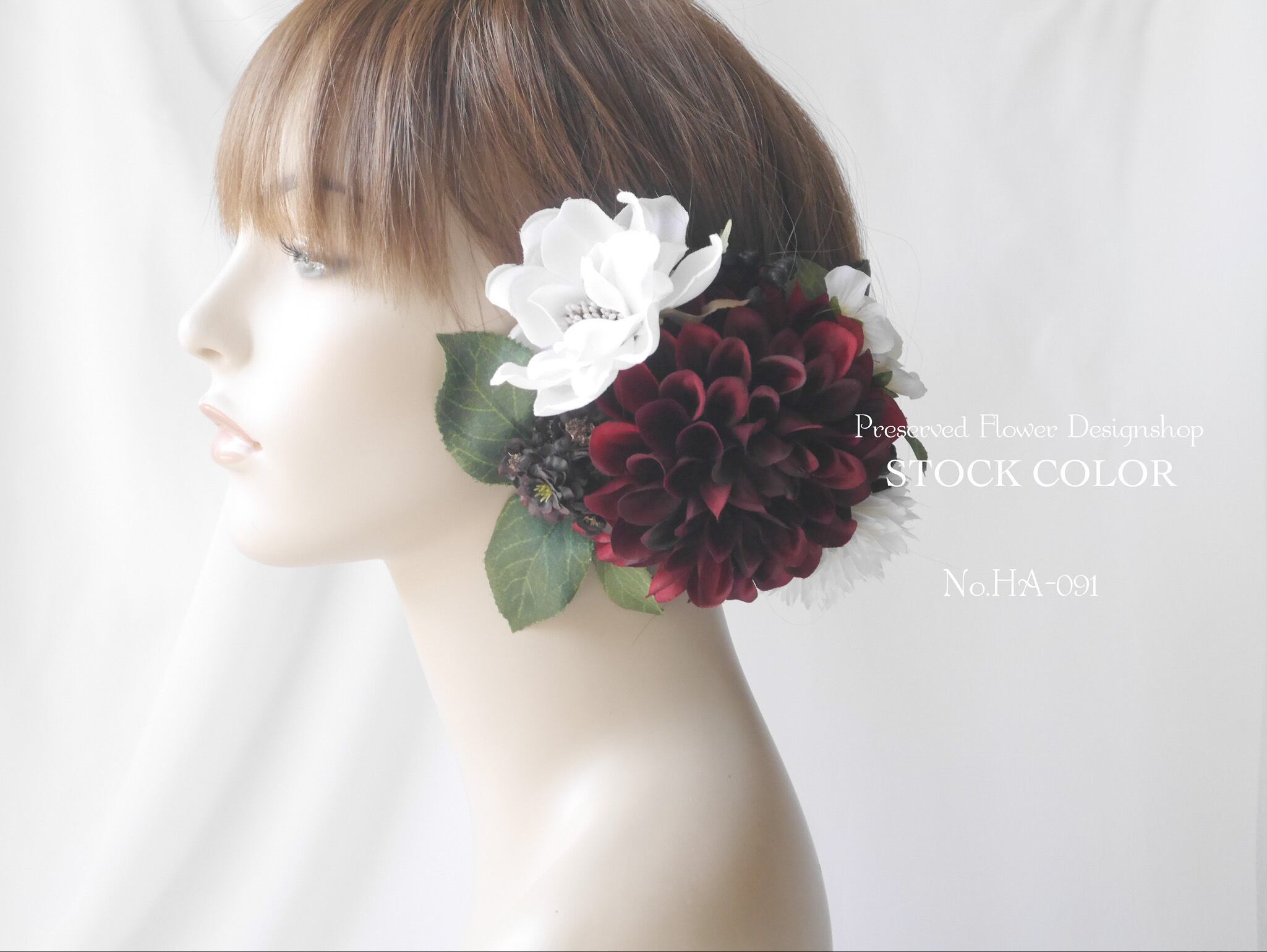 シックな赤いダリアにブラウンの小花やグリーンリーフ。和モダンで大人可愛い雰囲気のヘッドパーツは、白無垢、ウェディングドレス、成人式などにおすすめです♪