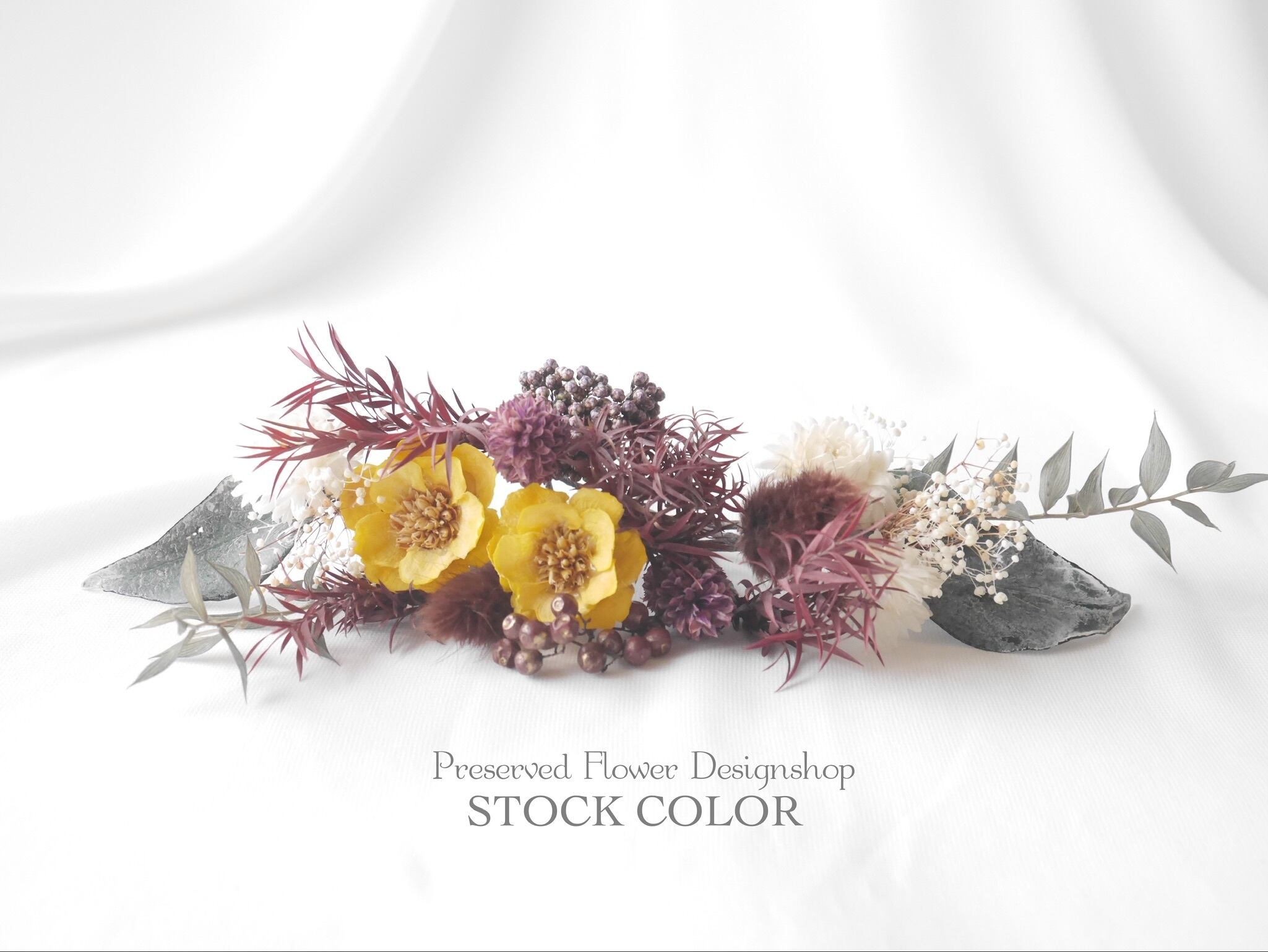 ブラウンベージュのかすみ草やライスフラワー、ペッパーベリーやリーフ...ひとつひとつの花材が自然素材ならではの表情と繊細な質感。パープルとバーガンディカラーの中に、イエローが効いたモダンでシックな大人可愛い雰囲気♪