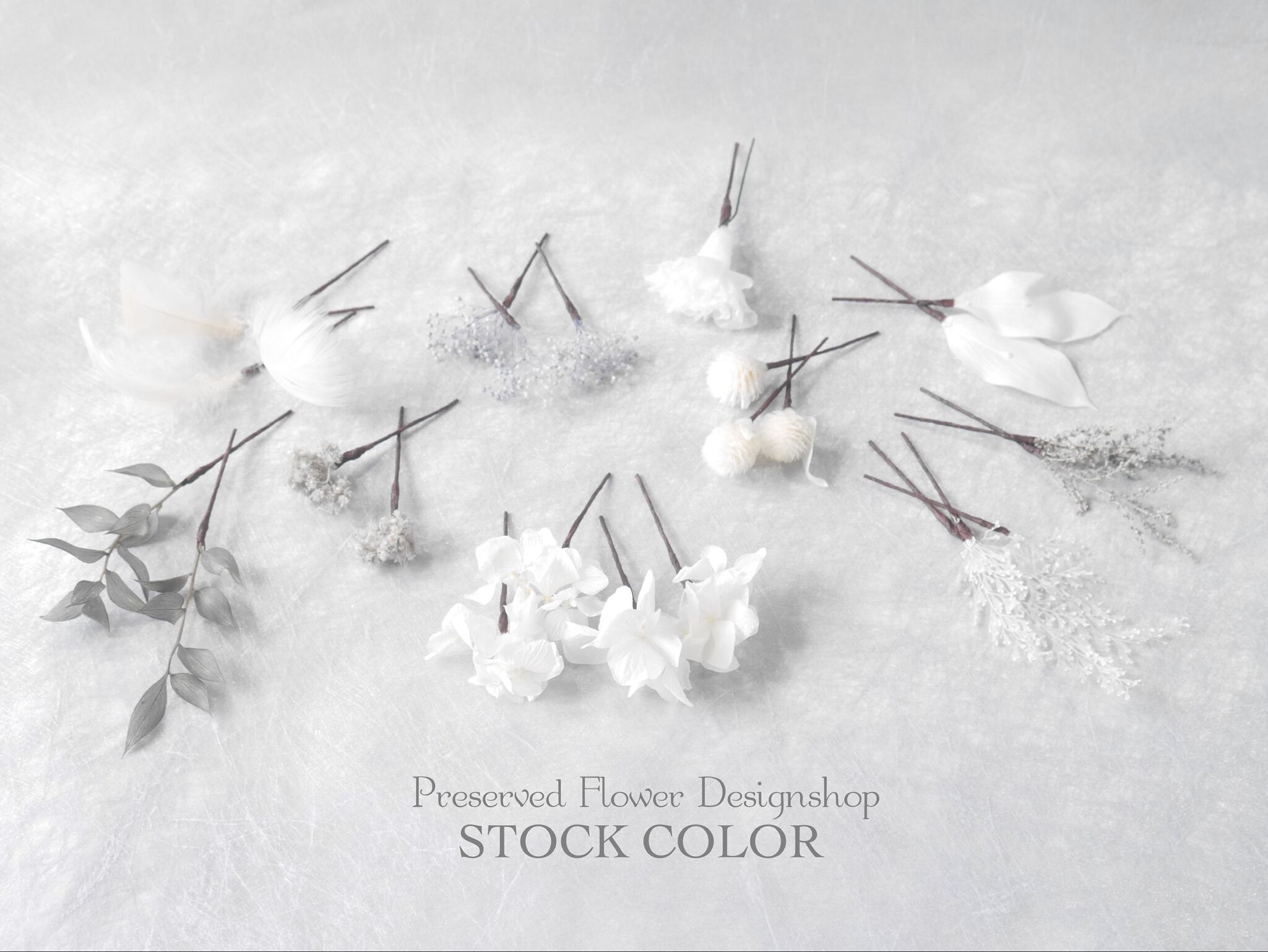 カーネーション、カスミソウ、アジサイ、センニチコウ、レースリーフ、フェザー、他