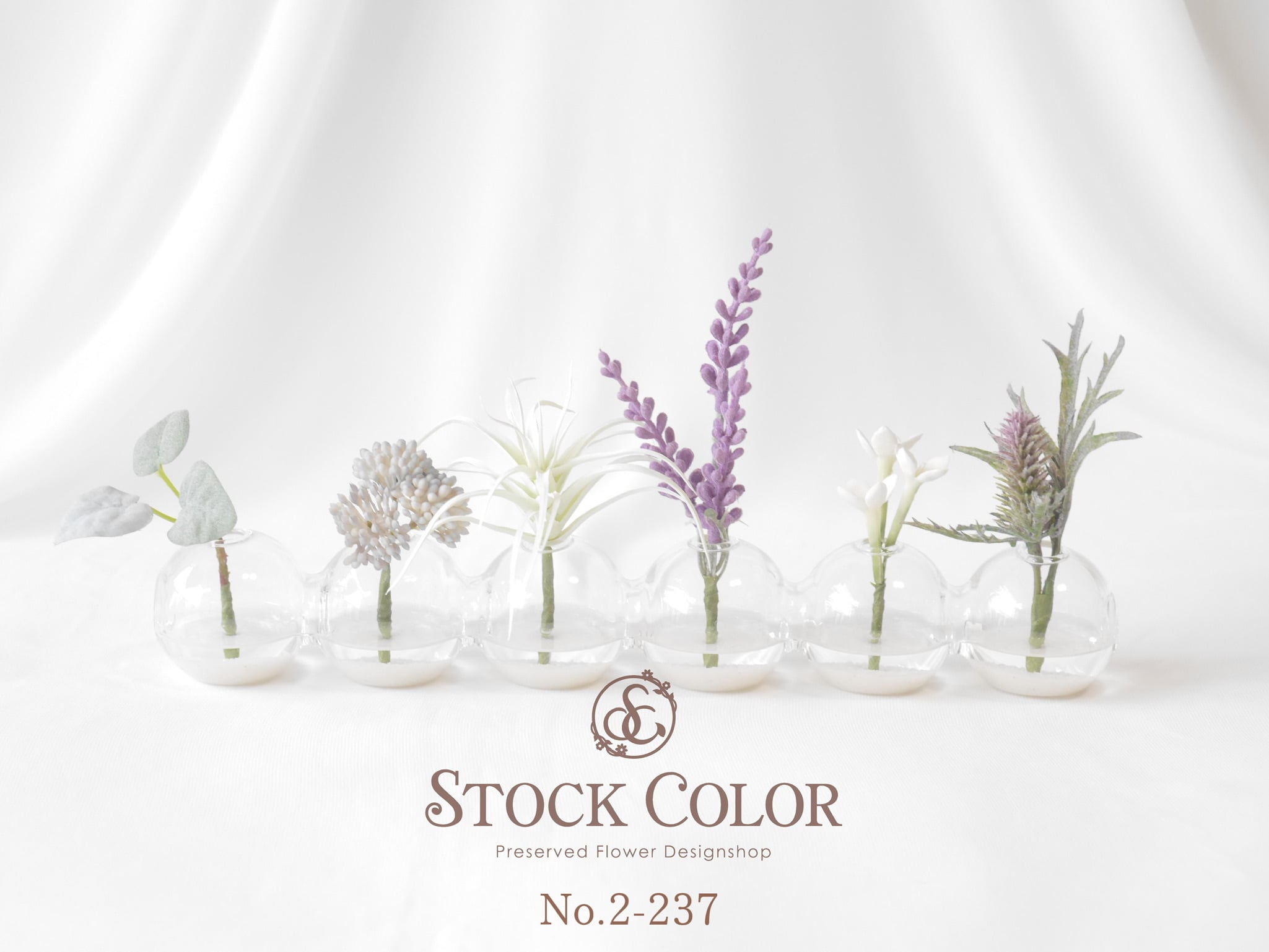 コロンとした可愛らしいガラスの6連フラワーベースに、フェイク多肉植物と小花を合わせたグリーンインテリア。