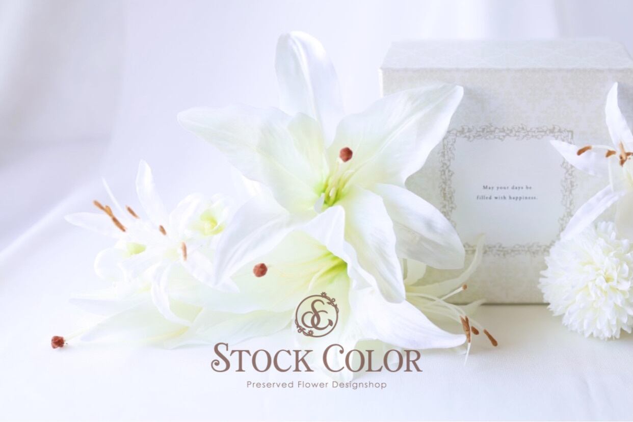 ユリと胡蝶蘭を人気のホワイト系花材でまとめたヘアパーツセット。大きめのユリが豪華で華やか♪ウェディングドレスはもちろん、和装 白無垢 成人式などにおすすめです。