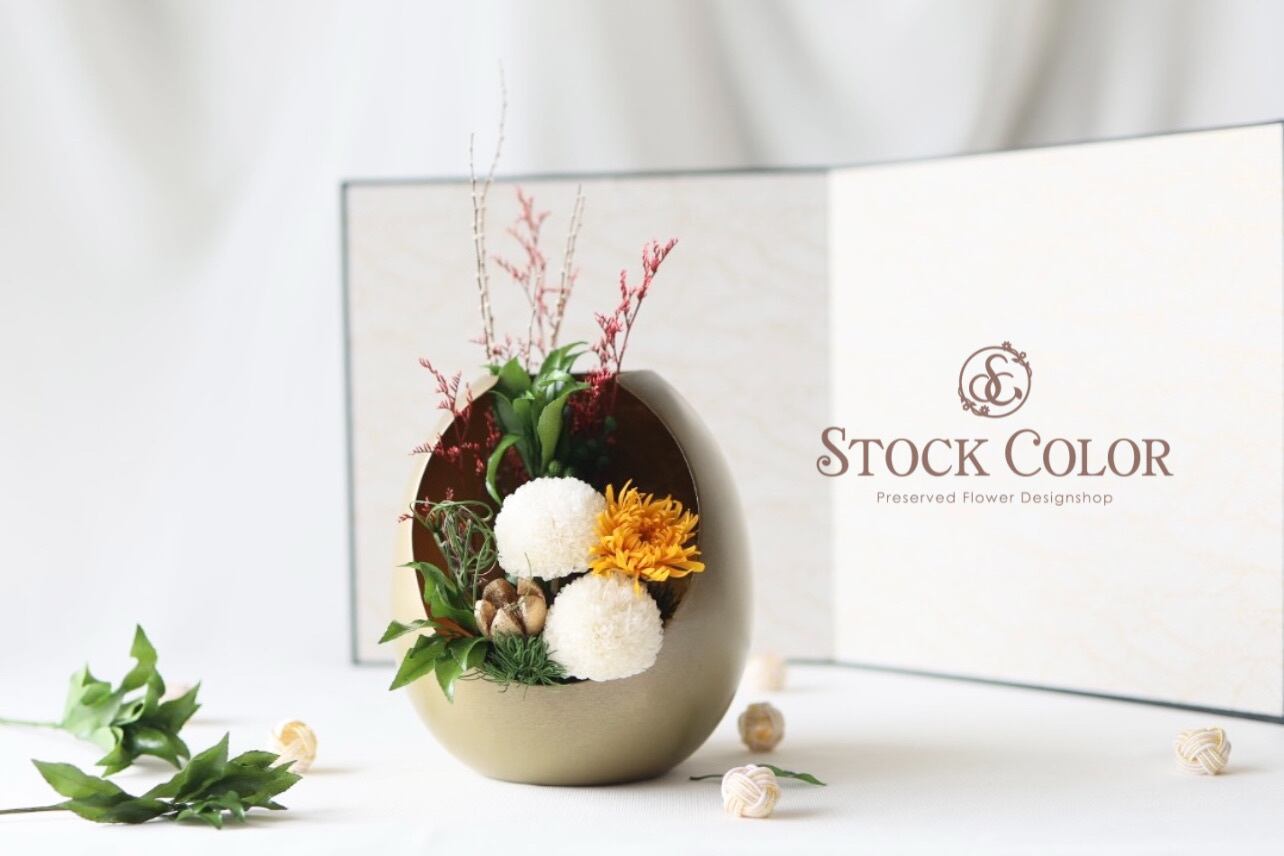 とってもスタイリッシュな花器に、枯れないお花プリザーブドフラワーのピンポンマムと小菊を使った、和モダンフラワーアレンジ。