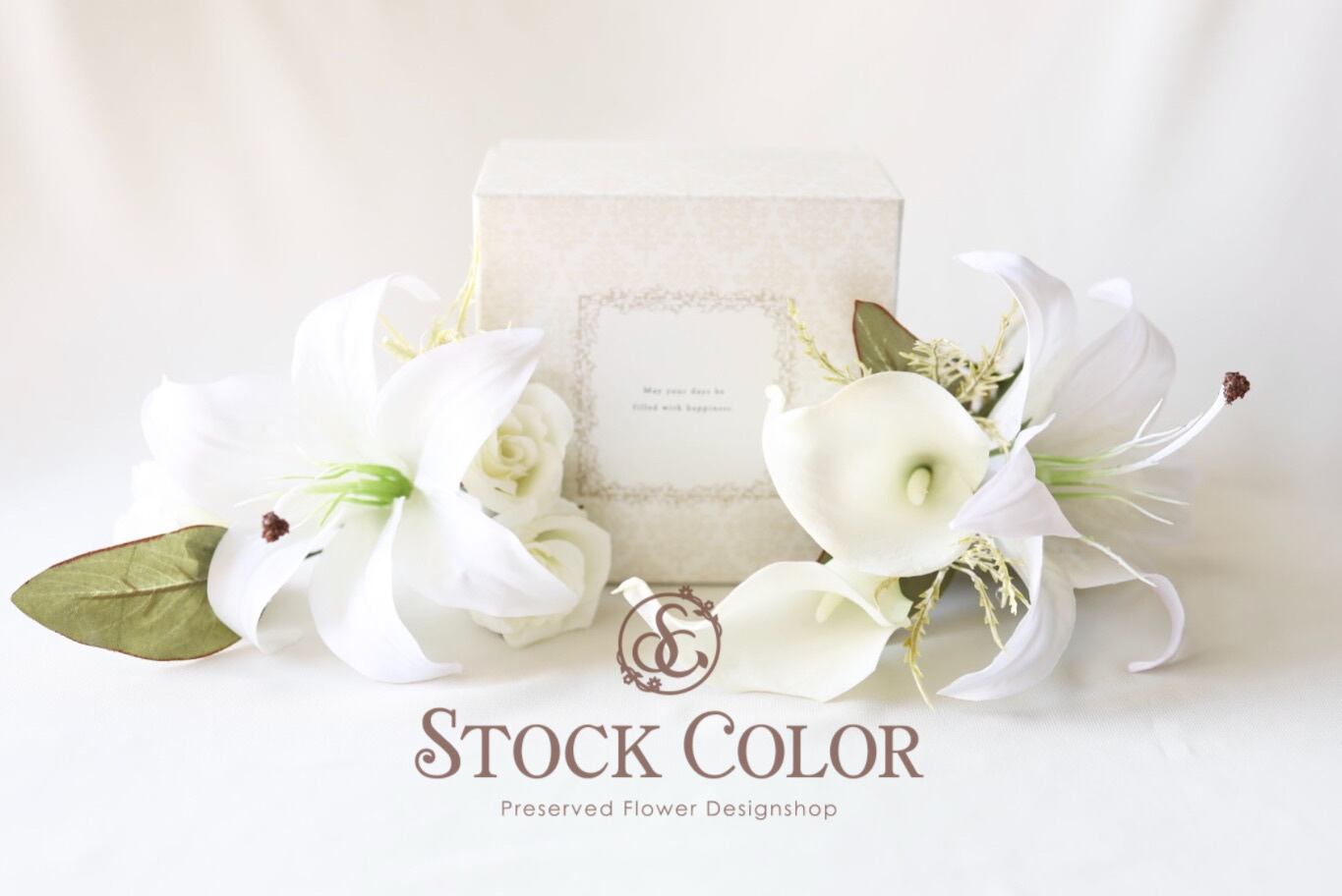 華やかなユリと凜とした美しさのカラーリリィ、上品で女性らしい雰囲気のヘッドドレスは、ウェディングや和装・白無垢、成人式にぴったりです。